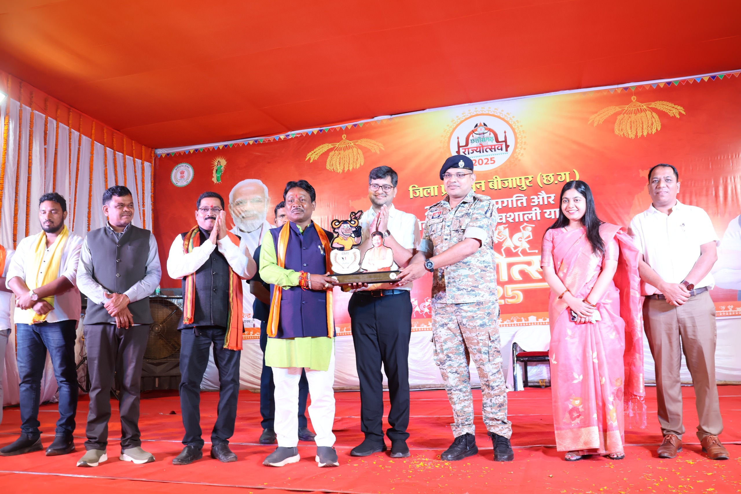 बीजापुर 03 नवम्बर 2025- छत्तीसगढ़ राज्य स्थापना दिवस के अवसर पर बीजापुर के मिनी स्टेडियम में जिला स्तरीय राज्योत्सव का भव्य आयोजन गरिमामय एवं उल्लासमय वातावरण में संपन्न हुआ। मुख्य अतिथि बस्तर सांसद महेश कश्यप ने छत्तीसगढ़ महतारी के छायाचित्र पर दीप प्रज्वलित कर कार्यक्रम का शुभारंभ किया।