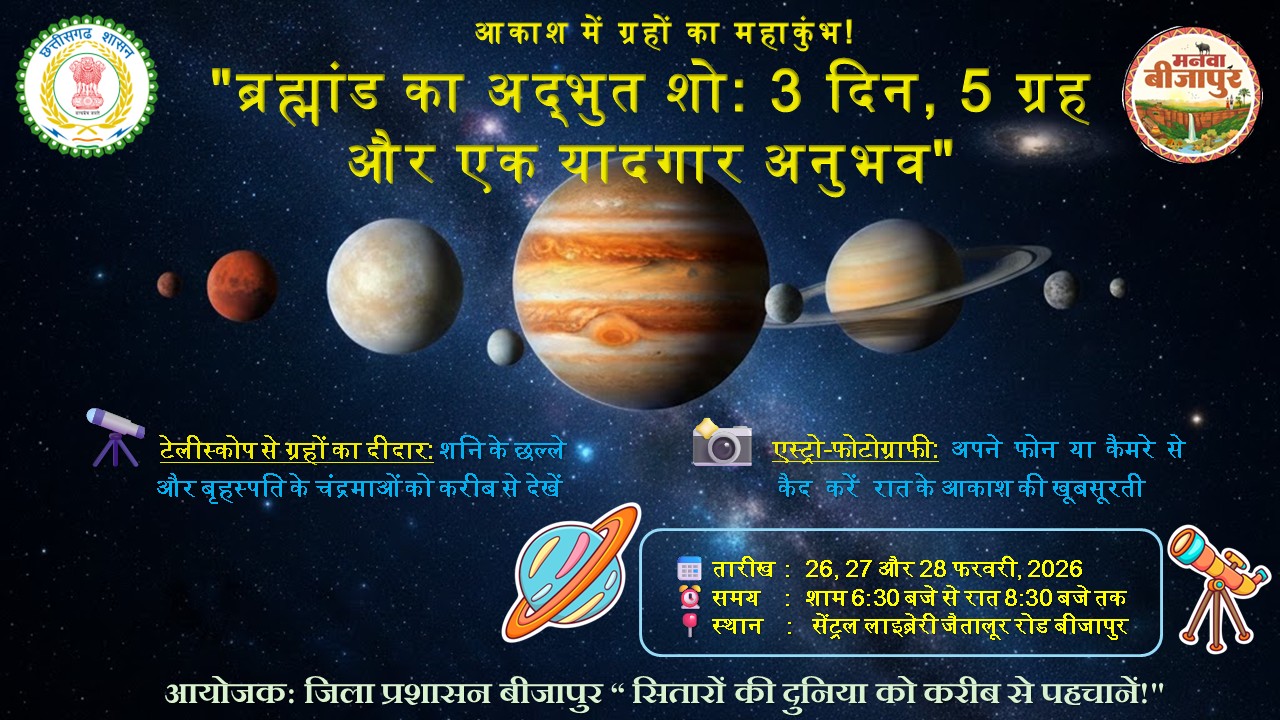 बीजापुर 18 फरवरी 2026/ जिला प्रशासन बीजापुर द्वारा नागरिकों के लिए एक अनूठा खगोलीय आयोजन “ब्रह्मांड का अद्भुत शो: 3 दिन, 5 ग्रह और एक यादगार अनुभव” का आयोजन किया जा रहा है। यह विशेष कार्यक्रम 26, 27 और 28 फरवरी 2026 को शाम 6:30 बजे से रात 8:30 बजे तक सेंट्रल लाइब्रेरी, जैतालूर रोड, बीजापुर में आयोजित होगा।